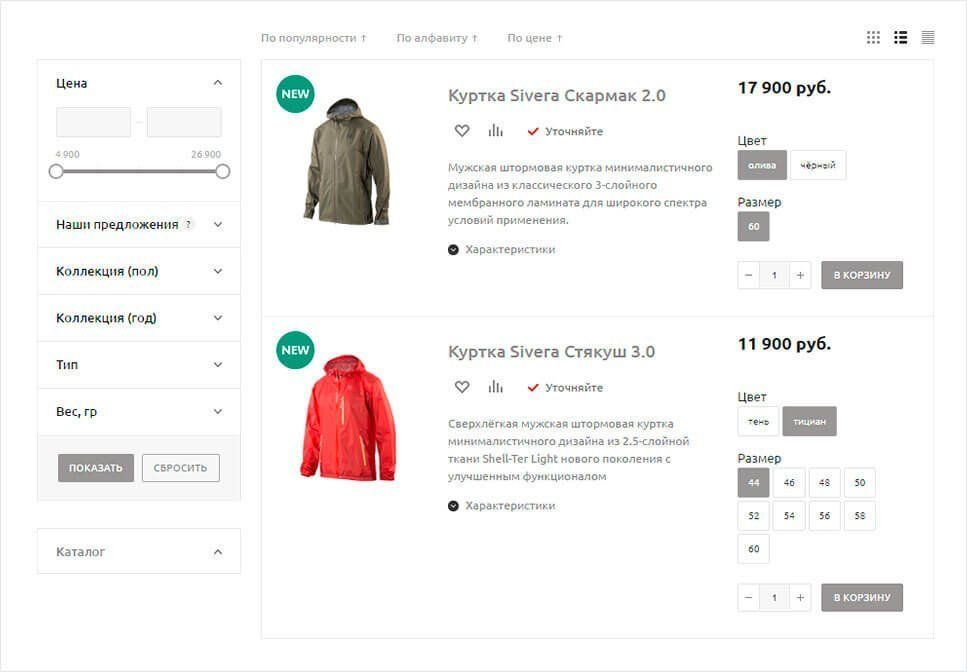 - смарт-фильтр с 6 параметрами, важных для покупателей альпинистского снаряжения - например, по весу куртки в граммах
